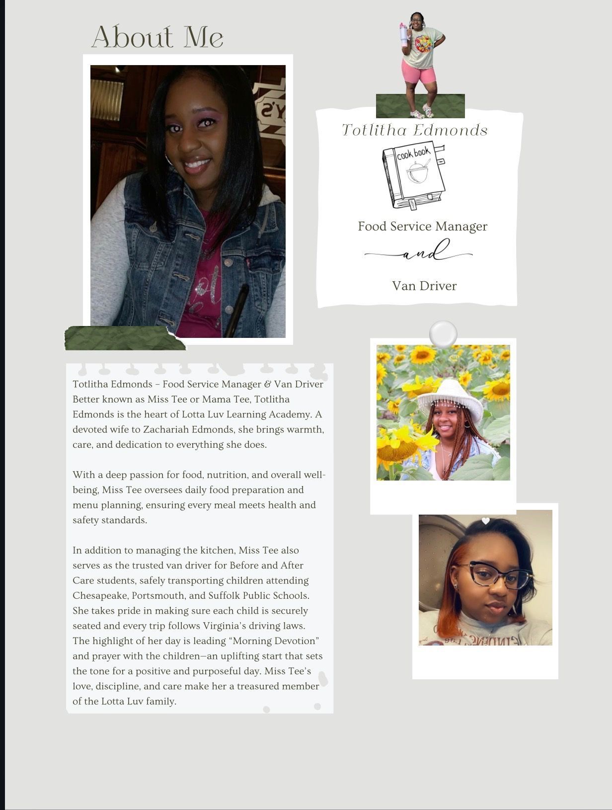 My name is Rita Zeiglar-Purcell, and I am the proud owner of Lotta Luv Learning Academy. With over 27 years of experience in childcare, I have dedicated my life to nurturing and educating children. Working with children has always been more than a profession — it’s a heartfelt calling and a lifelong dream.