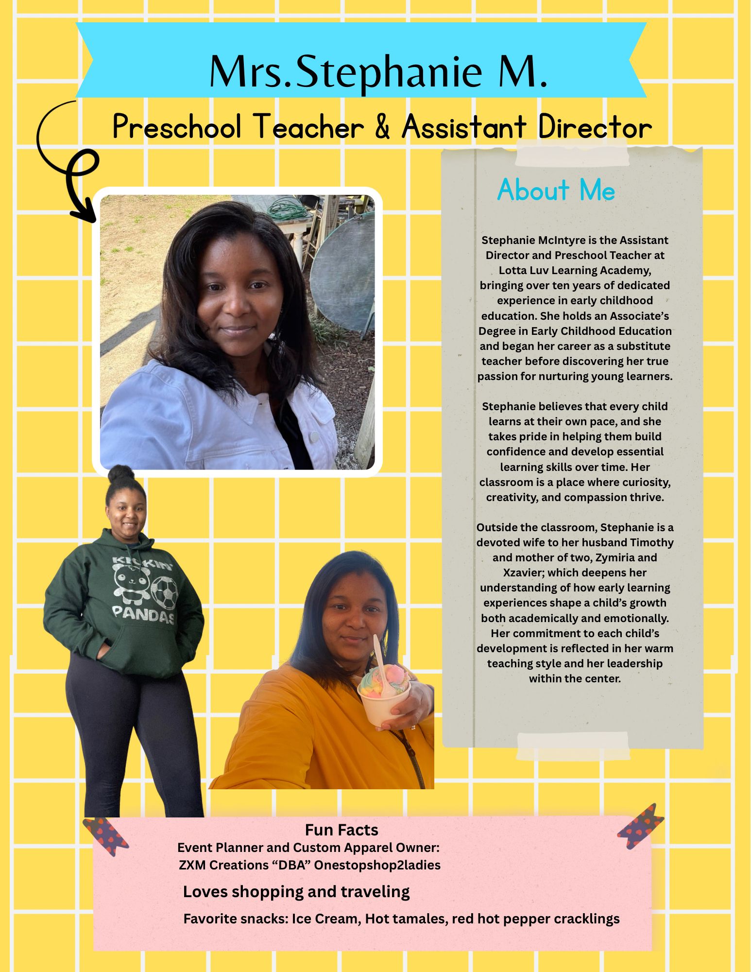 Hi, my name is Jazmona Simmons, and I’m the Lead Infant Teacher here at Lotta Luv Learning Academy. I’ve been part of the Lotta Luv family for three years, and for the past two years, I’ve had the privilege of leading the infant classroom.